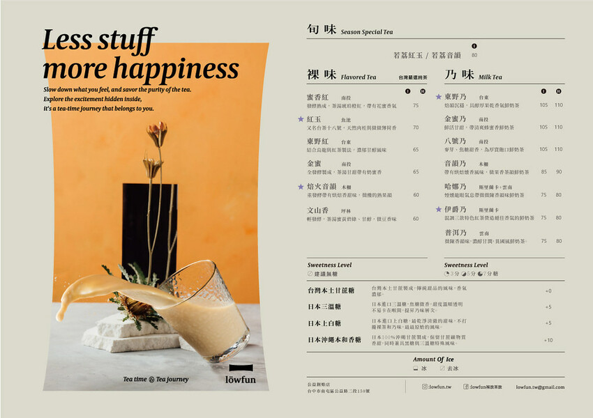 裸放茶旅lowfun以主打在地新鮮台灣茶為主,不過看菜單應該可以說是手搖飲料店中品項最少的,只有6款原茶跟7款鮮奶茶而已,最便宜65元起,以單價來說偏高些,但特別以低溫充氮技術呈現更好的茶飲風味。8/1(一)到8/14(日)特別推出八號乃、金蜜乃與音韻乃買一送一活動不要錯過!