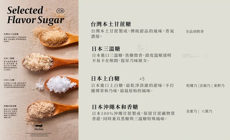 還有另一個特色是總共提供了台灣本土甘蔗糖、日本三溫糖、日本上白糖、日本沖繩本和香糖可以搭配。