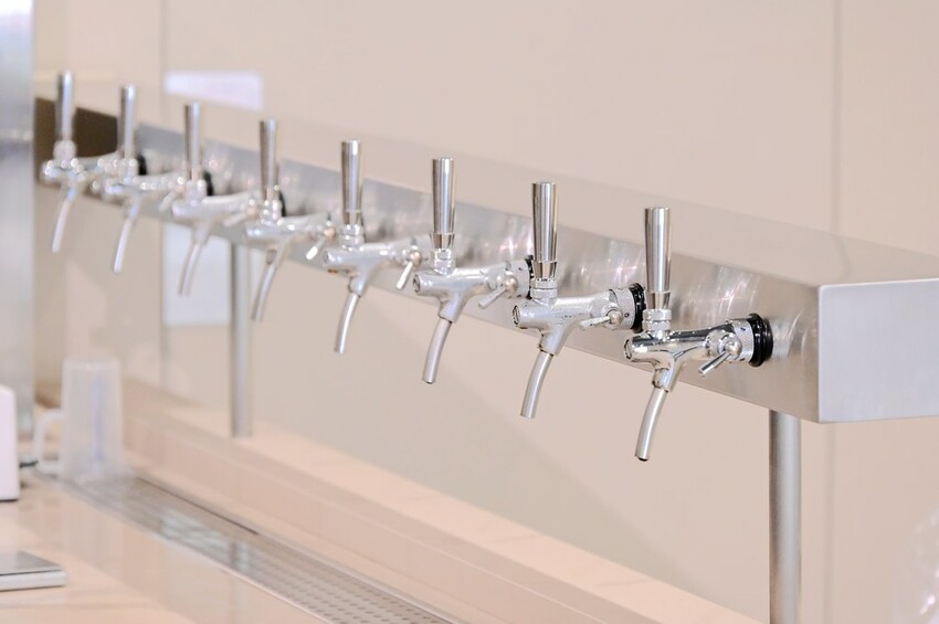 牆面只有幾幅簡單的海報,在吧檯旁邊設計了一條像是扶手但其實是提供給客人倚靠的立飲區,店內還有冷氣可以吹,櫃檯設置不同於一般飲料店的刻板印象,奇妙的是沒有整排茶桶,取而代之的是整排像是啤酒水龍頭的設置,