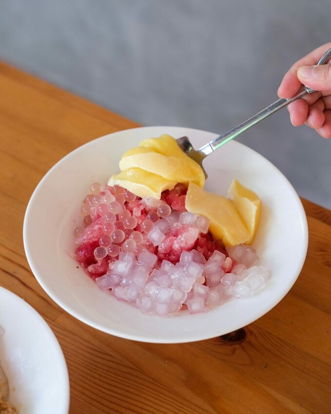 ▼單吃冰能感受到濃郁的花生香,拌著老油條及鹹蛋黃一同享用,爆爆珠在口腔爆炸的甜香,冰粉的Q彈滑順,意外碰撞出鹹甜的迷人火花~