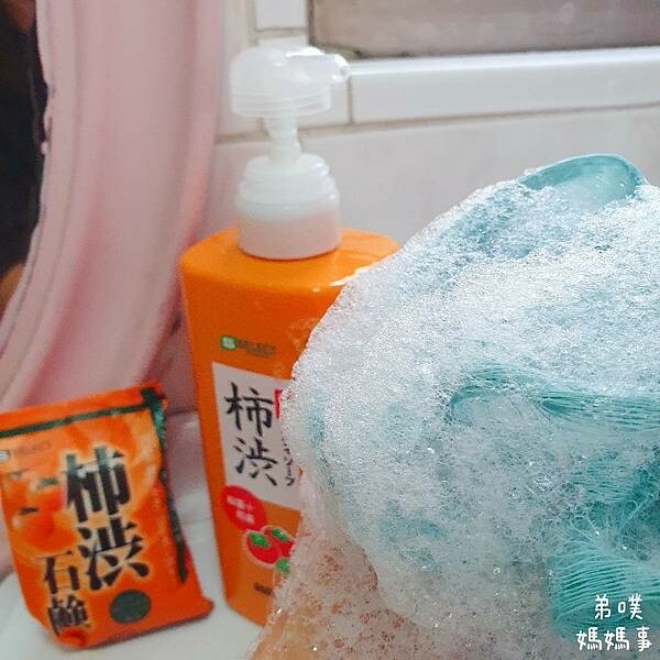 "抗菌柿澀沐浴乳"擠出來是透明的,搭配沐浴球來看看含有柿澀天然成分的起泡威力如何?