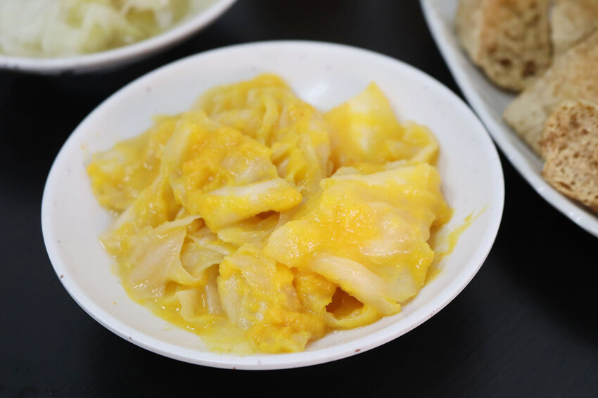 另外也可以加點自製黃金泡菜,以高麗菜、豆腐乳、薑片、蘋果、芝麻油、少許辣椒等食材製成,香辣過癮超開胃