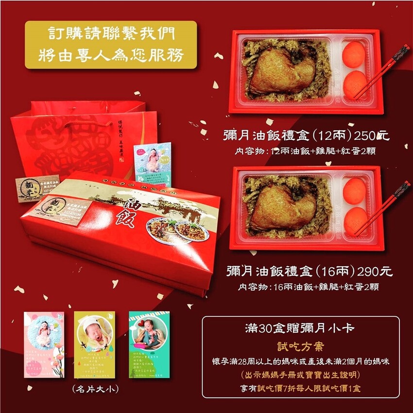 ▲「龍來小館」的彌月油飯禮盒,有12兩和16兩這兩種選擇!