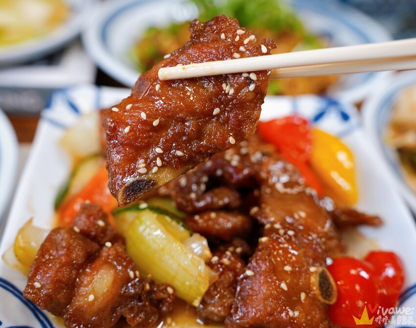 ▲桔汁排骨一旁有洋蔥、小黃瓜、甜椒搭配,讓色澤看起來很繽紛,更引人食慾!這排骨口感紮實軟嫩~酸酸甜甜的桔汁吃起來特別開胃下飯!
