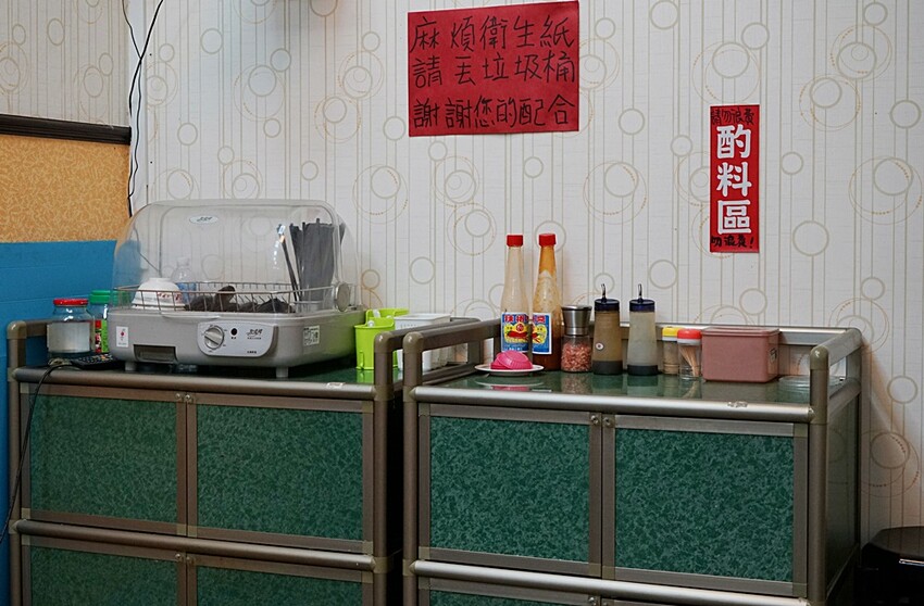 餐具區及醬料區。醬料有自製辣椒醬、黑醋、紅醋、胡椒粉、東泉辣椒醬,依照個人需要斟酌拿取