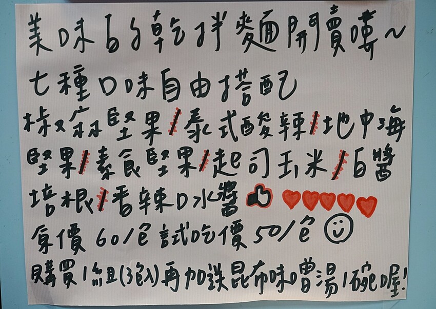 因應疫情頂極雞肉飯也推出乾拌麵,有椒麻堅果、泰式酸辣、地中海堅果、起司玉米、白醬培根、香辣口水醬以及素食堅果等七種口味!現在試吃價只要$50/包,而且購買一組3包入還加送昆布味噌湯/碗