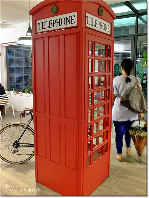 還特別空出一大塊位置不擺放座位,竟拿來放電話亭還有一台腳踏車,讓整家店面有畫龍點睛的效果,讓人眼睛一亮,算是整間餐廳最大亮點了,而且也是可以提供給客人拍照的點。