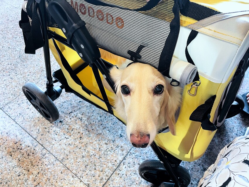 現在有了寵物推車 讓牠在裡面乖乖待著 終於可安心用餐了~