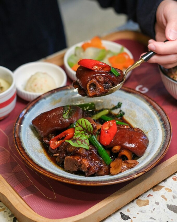 ▼擁有油亮色澤的醬燒三杯豬腳,以九層塔添香提味,QQ的外皮夾起時還會抖動,吃起來彈牙中帶嚼勁。