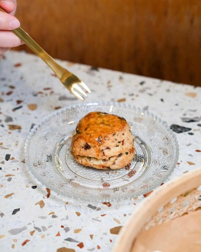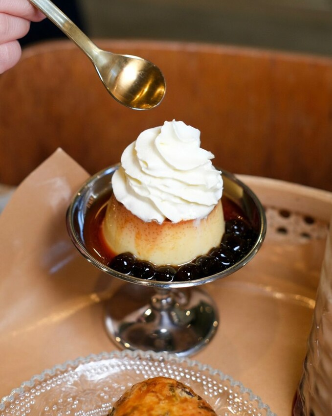 ▼咬下青蔥培根司康讓人驚喜,充滿青蔥與培根的味道,而且不會過乾;手作焦糖昭和布丁嫩Q,鮮奶油和珍珠為口感加分,吃起來富有層次,湯明紅奶茶類似冰沙的質地,夏天喝起來相當消暑~