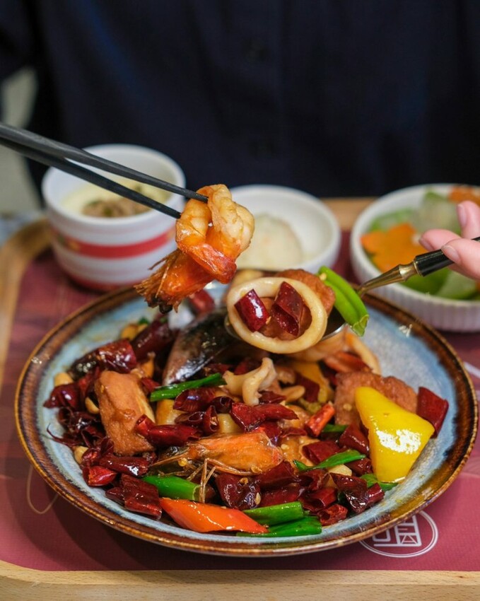 ▼將魷魚、魚肉片、淡菜與花椒、蔥段、大蒜下鍋拌炒,再加入軟嫩的豆腐帶來堆疊感,每塊食材外層包裹著醬汁,辣中帶甜,還有乾煸辣椒與乾花生帶出的強烈香氣,可以說是一道白飯殺手~