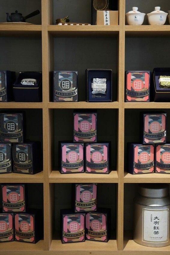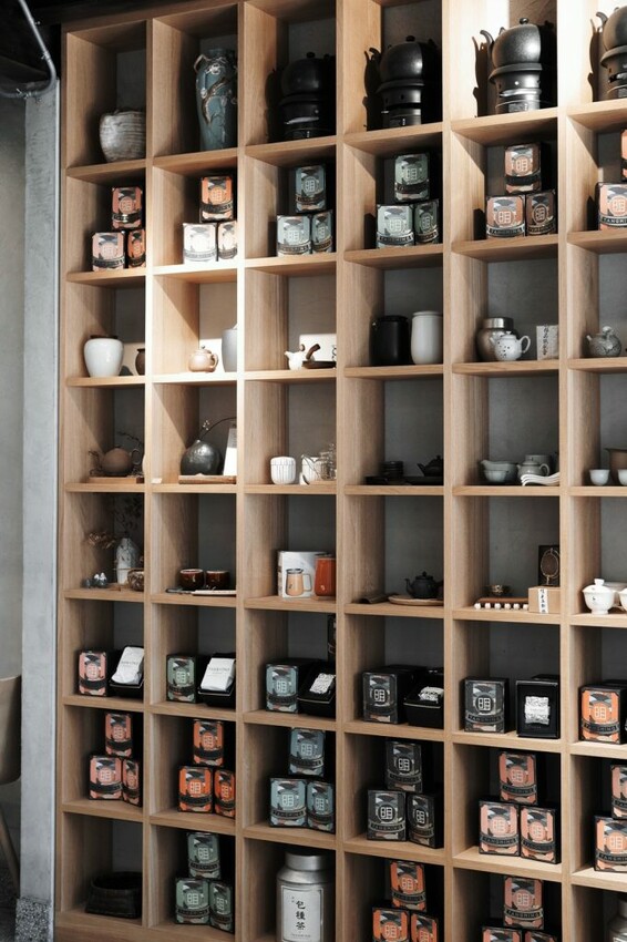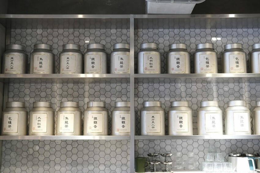 ▼【湯明茶樓】以樓中樓的天井設計為主軸,從一樓吸睛的茶牆延至二樓的茶牆,讓整體的空間看起來充滿通透感,自然的採光也使用餐環境更明亮,櫃中擺放各式店裡販售的茶葉及茶具,如果有喜歡的都可以現場購買!