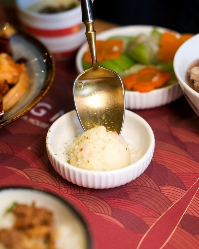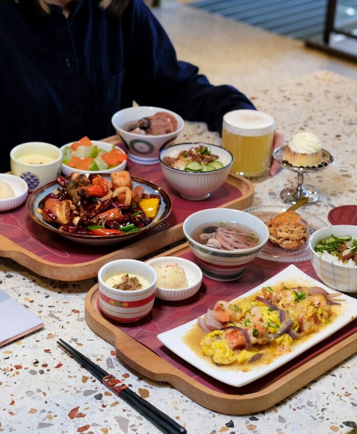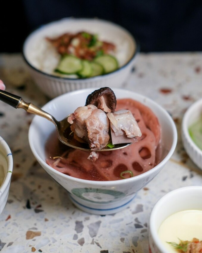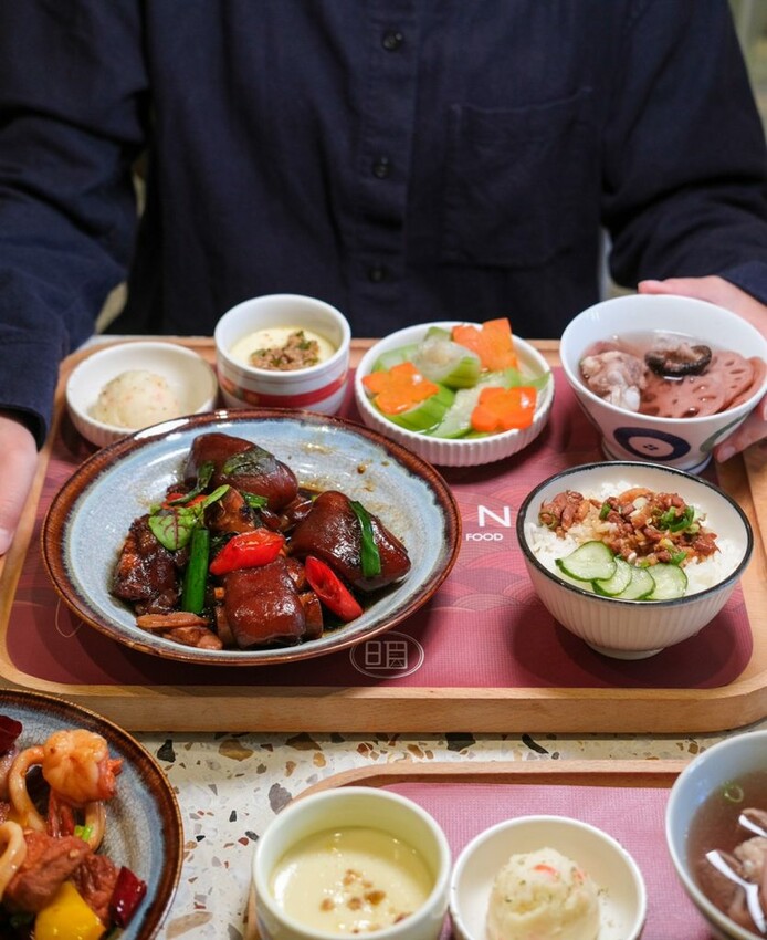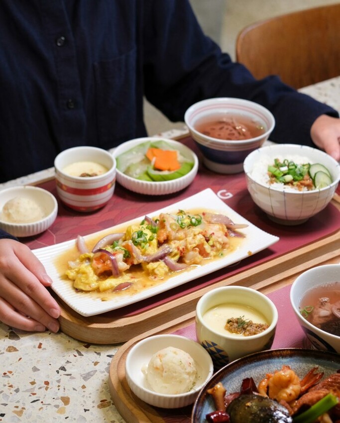 【湯明茶樓】供應個人套餐式的台式料理,主打富有新意的古早私房手路菜,套餐包含三樣小菜、湯品和甜點,還有可以免費續加的越光米飯,同時也有提供甜食、茶飲和下午茶品項,因應疫情更推出了冷凍調理包組合,餐點的選擇相當多元豐富。