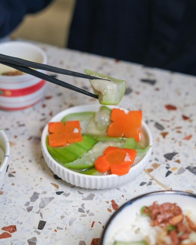 ▼這次吃到的小菜是淋上肉末,吃起來滑順嫩口的蒸蛋、清淡熟透的燉絲瓜和綿密的馬鈴薯泥,例湯是蓮藕排骨湯,裡頭還有好幾片香菇,湯頭溫潤爽口,排骨燉的軟爛一咬就分離。調味上來說都比較清淡,可以感受到食材最原始的滋味。