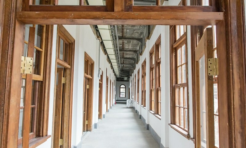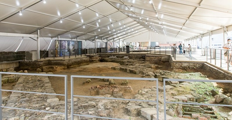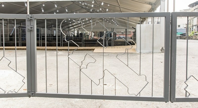入口鐵門上的圖形是以考古現場挖到的物品為藍圖線條而成,對面大樓牆上的畫作則是想像中諸聖教堂的模樣。