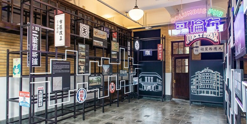 以街景為例,在這間位於一樓的展覽室,你可以看到以各式各樣「かんばん」(看板)及線的串起與勾勒出的基隆街景演化史,代表的是基隆早期以日本人和漢人的轉口貿易、傳統漁業聚落為主,以及清領末期開港通商後,漢人逐漸進入基隆定居,促使都市化形成。日治時期,總督府將基隆打造為臺灣對外交通的門戶,建設和產業一併迅速擴張,在實施一連串的市區改正計畫後,成為了現代化都市。戰後大量移民的湧進、美援時代的大兵來臺,不同的族群帶來各色文化,人群的往來促使港口文化蓬勃發展,也造就基隆多樣而深邃的街道景色。
