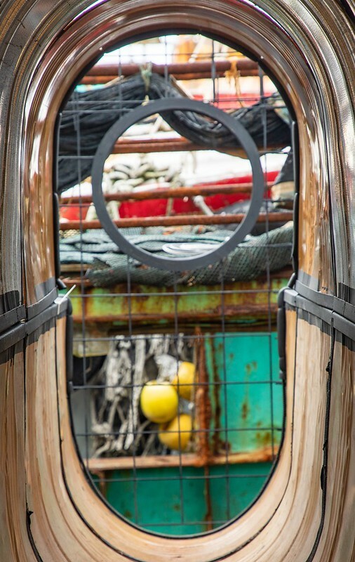 〈那座孤島正向前航行〉由吳季禎老師以正濱漁港鐵鏽斑斑漁船上,如鏡子般直徑3公尺/直徑2公尺的球面上文字與觀者進行無聲的互動,讓文字轉譯地方的時間與空間,過去現在未來又屬於誰,那座孤島正向前航行。