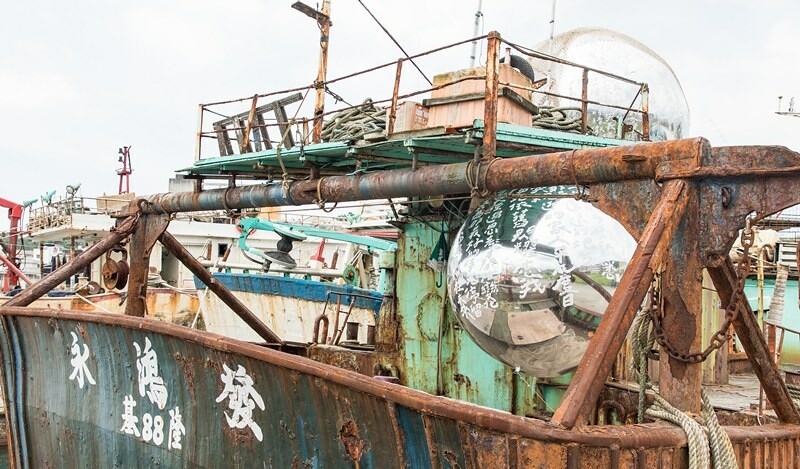 〈那座孤島正向前航行〉由吳季禎老師以正濱漁港鐵鏽斑斑漁船上,如鏡子般直徑3公尺/直徑2公尺的球面上文字與觀者進行無聲的互動,讓文字轉譯地方的時間與空間,過去現在未來又屬於誰,那座孤島正向前航行。