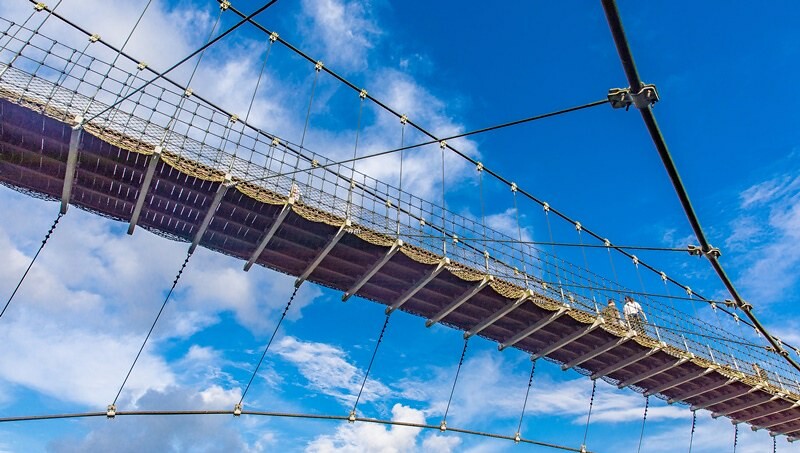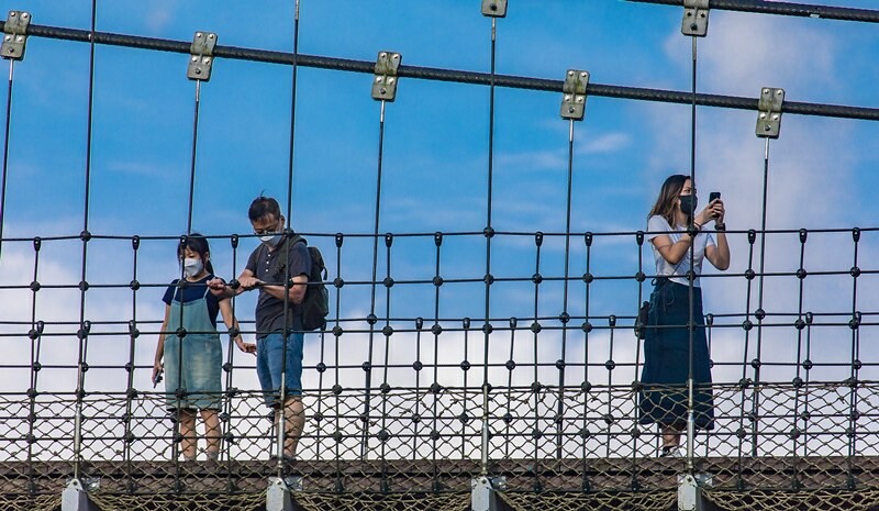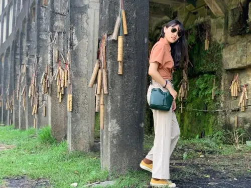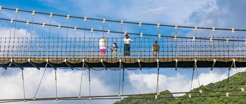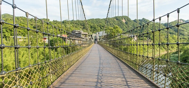 出走月台你會發現一座藍色的吊橋,那是建於1947年橫跨基隆河的靜安吊橋,一開始自然是為了要運送煤礦,後來媒礦停採之後,就改建為行人專用的交通要道。要去望古鐵道祕境拍攝景點,不是要過橋,而是要穿越橋下而過。