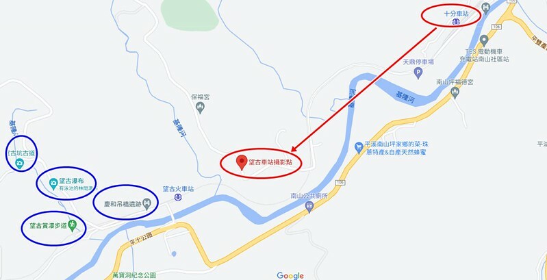 雖然我們要拍的是望古車站,但下火車的地方得是十分車站,步行約莫需要20分鐘,多數的攝影朋友都是開車或是騎車,那就跟著google map指示開就成,拍攝點就在公路上,不難找到。記得,千萬別跟我一樣,自以為聰明的在望古車站下車,以為比較近....你就會發現隔著一條溪...除非,你有讓劉皇叔躍馬過檀溪的的盧馬....。順便說一下,望古車站其實有我一直沒去過的望古瀑布。