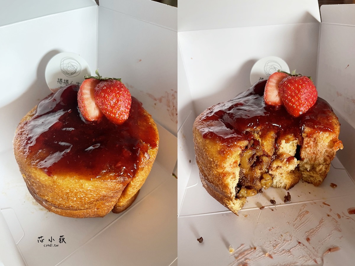 士多啤梨就是草莓肉桂捲(網路資料說士多啤梨是港式的叫法,都是指草莓的意思),上面淋上草莓醬以及新鮮草莓,讓肉桂捲增添酸甜滋味。