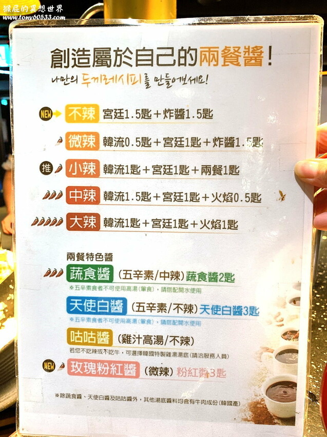 且不吃辣的人也能調配不辣的醬汁,大家對韓式料理印象都是很辣,兩餐這點還滿貼心,有貼出牌子告訴大家怎麼調醬汁,從不辣到大辣都可以自己調整,用餐過程中也可以自己增加口味,太鹹太辣也可以加湯,不吃辣的也能來兩餐。