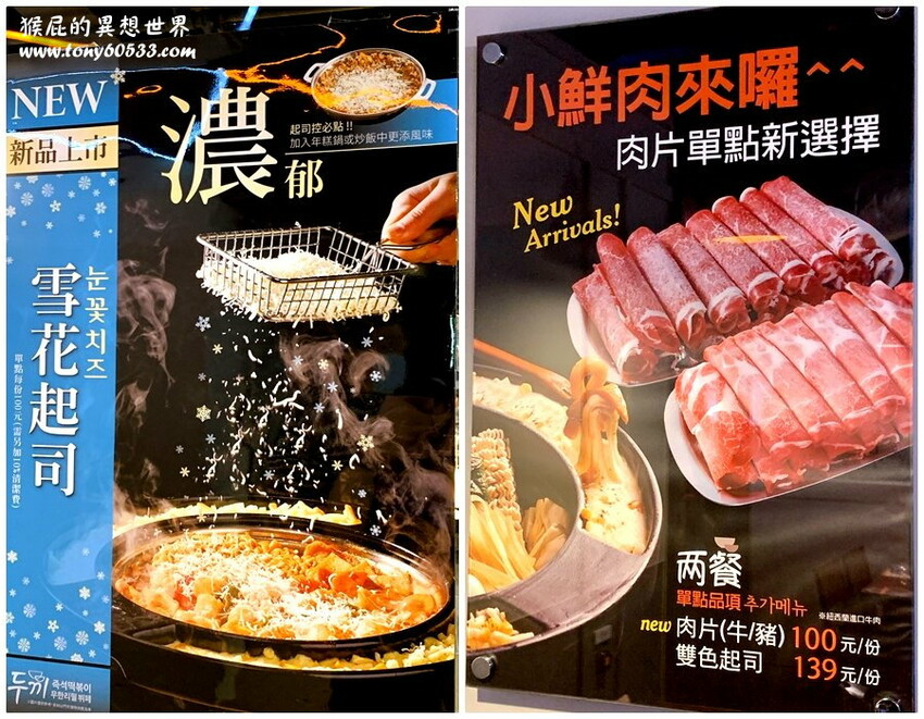 肉片可以選吃到飽也可以單點,個人覺得吃到飽比較划算,然後雙色起司跟雪花起司都滿推的,尤其雙色起司超建議加的,吃起來很有儀式感用途也很多,從第一餐開始到最後都可以用。