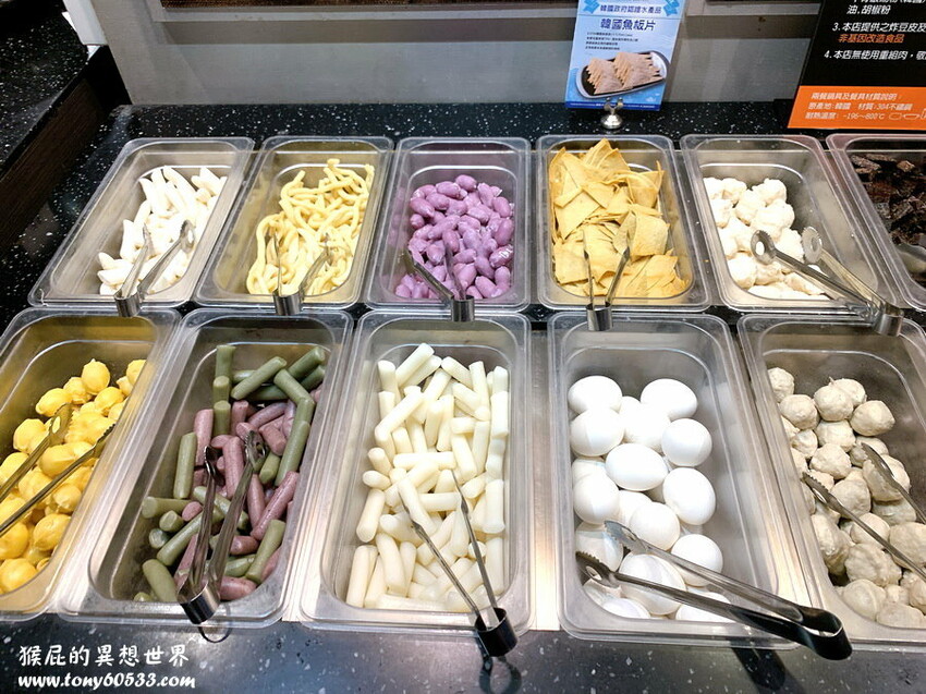 這一區滿滿的年糕、火鍋料跟青菜自行取用,尤其年糕是兩餐的特色,有超多種口味的年糕,基本上每個各拿一個就會很飽,因為年糕也是澱粉類,然後魚板一定要拿,韓國進口認證魚板怎麼能不吃,這一區內有唯一的海鮮就是魷魚,他魷魚滿Q的很好吃,喜歡吃海鮮可以拿。