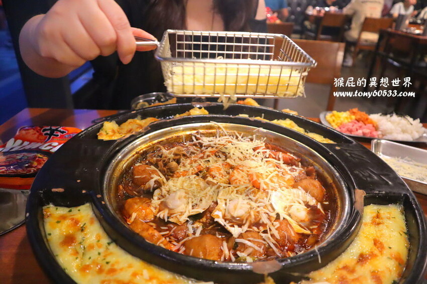 滿滿一桌超過癮的阿,我們今天吃的是449元的肉肉吃到飽方案,海鮮是另外單點的一盤149元,那圈雙色起司也是另外單點一份139元,那個雙色起司真的很推,很百搭,可以搭配炸物或搭配年糕或搭配肉都很讚,美味度直接提升一個檔次,沒用完的起司最後炒飯還可以加,超多用途。