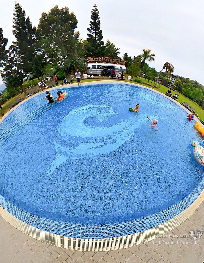 泳池前的露營車在燈光下也給人一種不同的感覺,