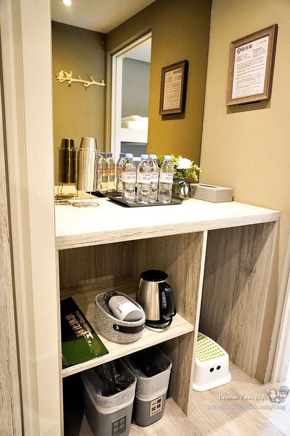 幫大家準備好杯子、礦泉水、熱水壺、吹風機、髒衣袋和小椅子,