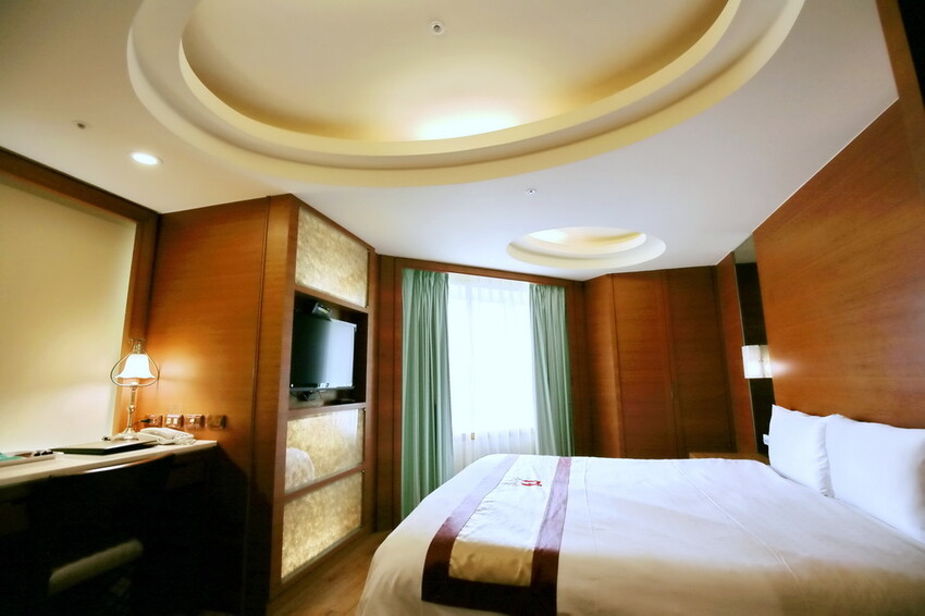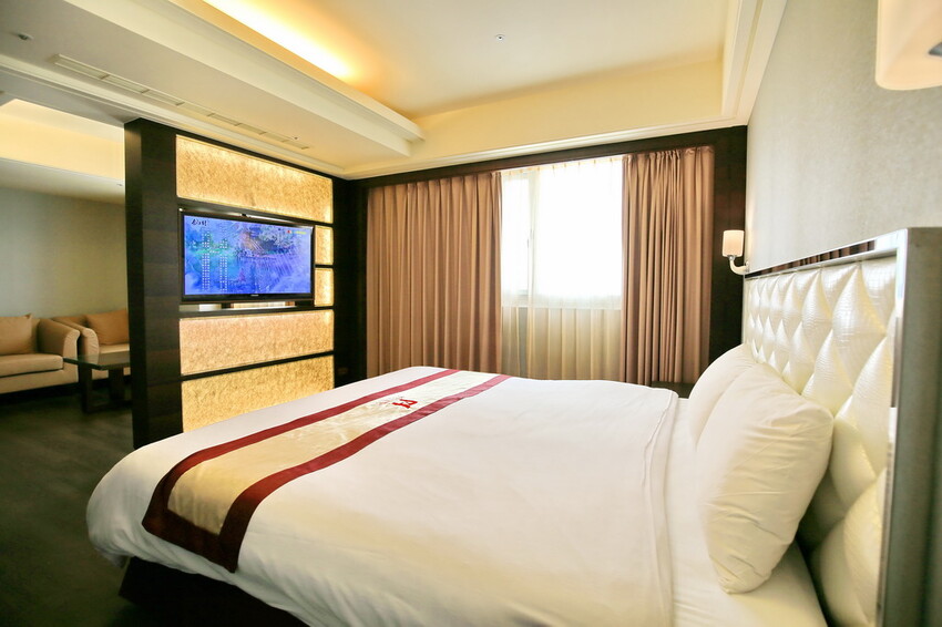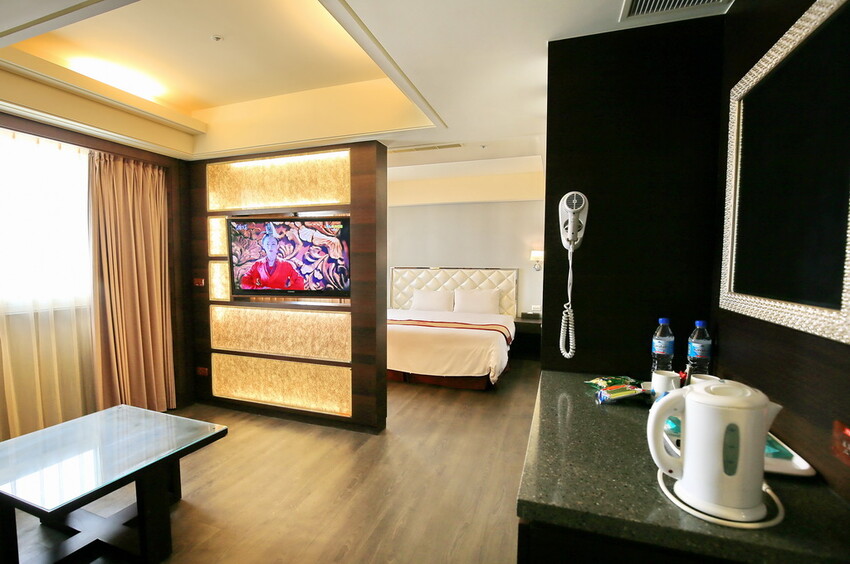 行政套房的電視放在房間中央可以旋轉,房客可以在小客廳、在床上都可以看電視,無論哪一種房型,客房提供免費WIFI、冰箱、平面電視。