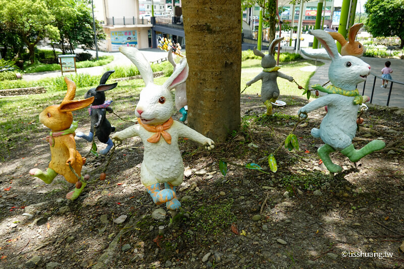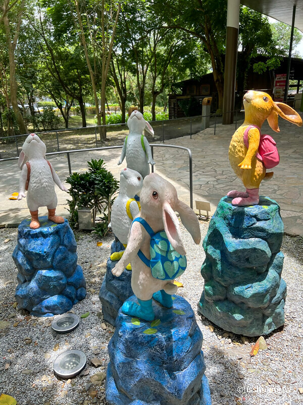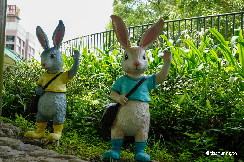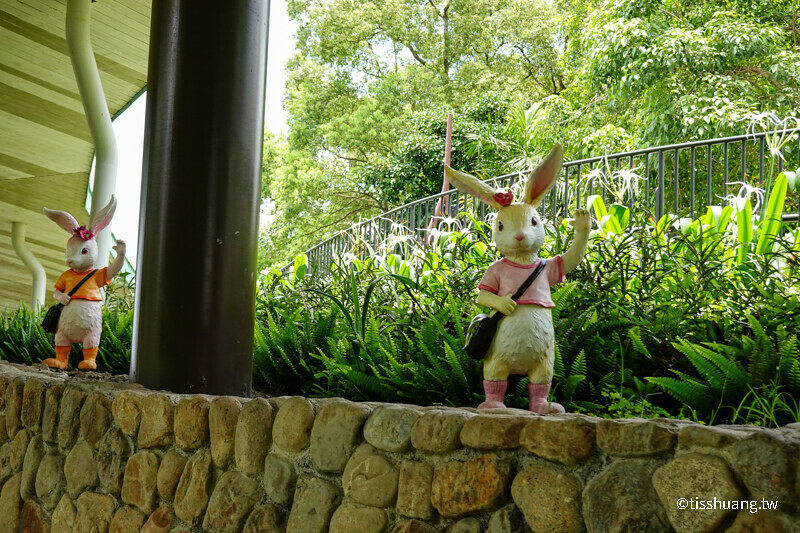 順著走廊往上走,就會看到許多幾米造景,有拉著行李的兔子、蹺蹺板毛兔,還有抬頭、招手及跳舞小兔、舒服泡湯的超萌兔共29隻,看看我們一共找到幾隻兔子,小兔拖著行李箱上,設計有黃嘴角梟、淡紋青班蝶的圖樣