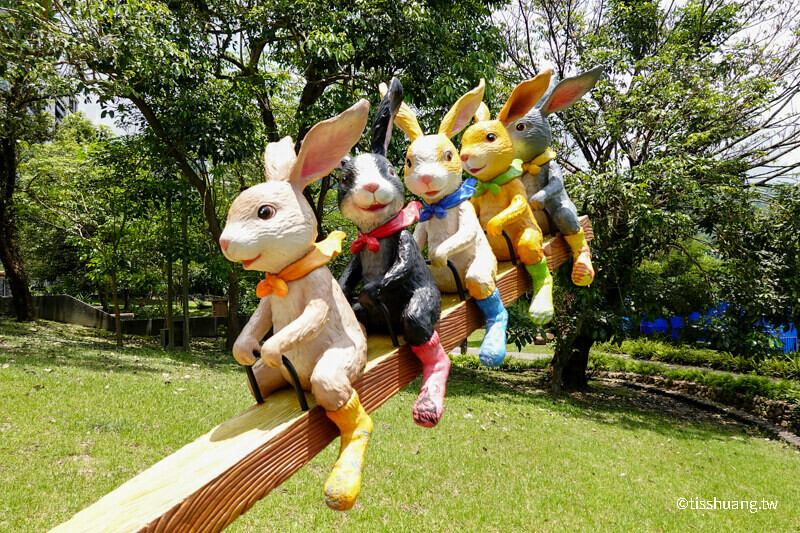 裝置藝術創作源於「毛毛兔」繪本,每一隻兔子巧妙設計獨一無二的動植物圖案,除非仔細觀察,否則不容易發現,翹翹板只能假裝坐,不能真的坐喔!