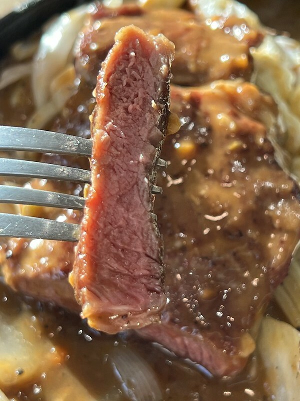 切了一下後,發現肉排比夜市的牛排厚實多了,