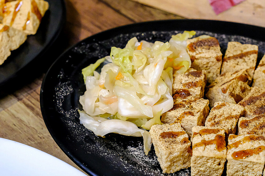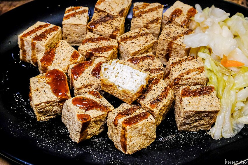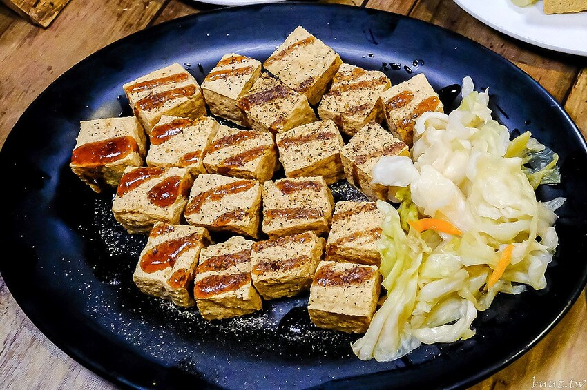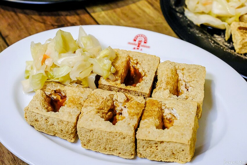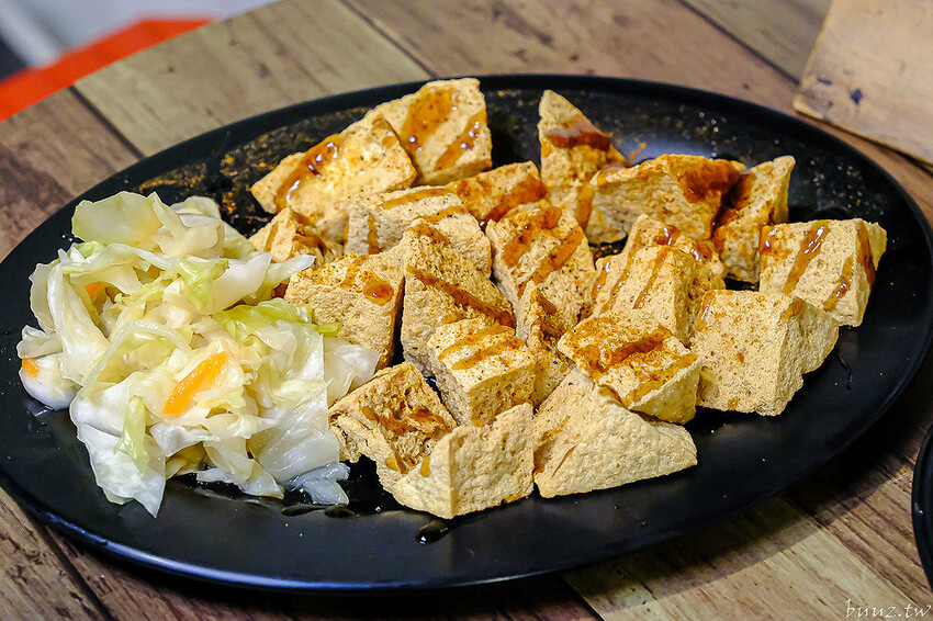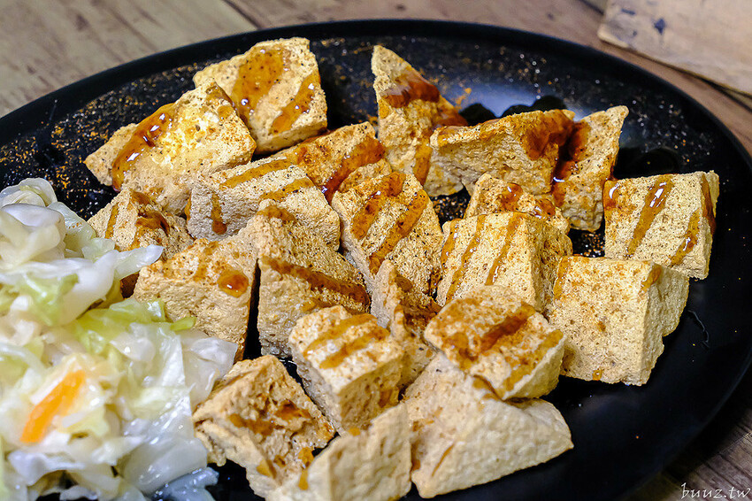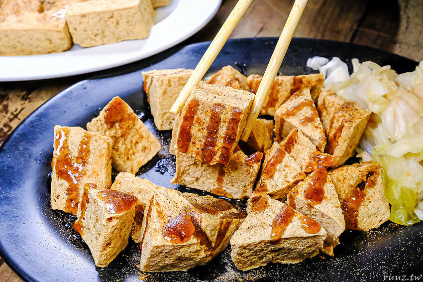 店內招牌臭豆腐有分5塊跟8塊,點8塊相對價錢更划算些,豆腐本身有先用蔬果配方醃漬發酵過,客人點單後才會下油鍋去炸,起鍋後再淋自製蒜香糖醋醬配泡菜。