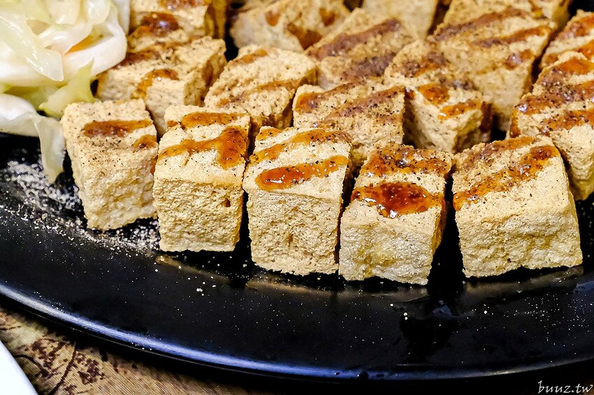 緊接著再來吃吃這個一口酥臭豆腐,除了有淋甜油膏還有撒胡椒粉,同樣搭配台式泡菜。