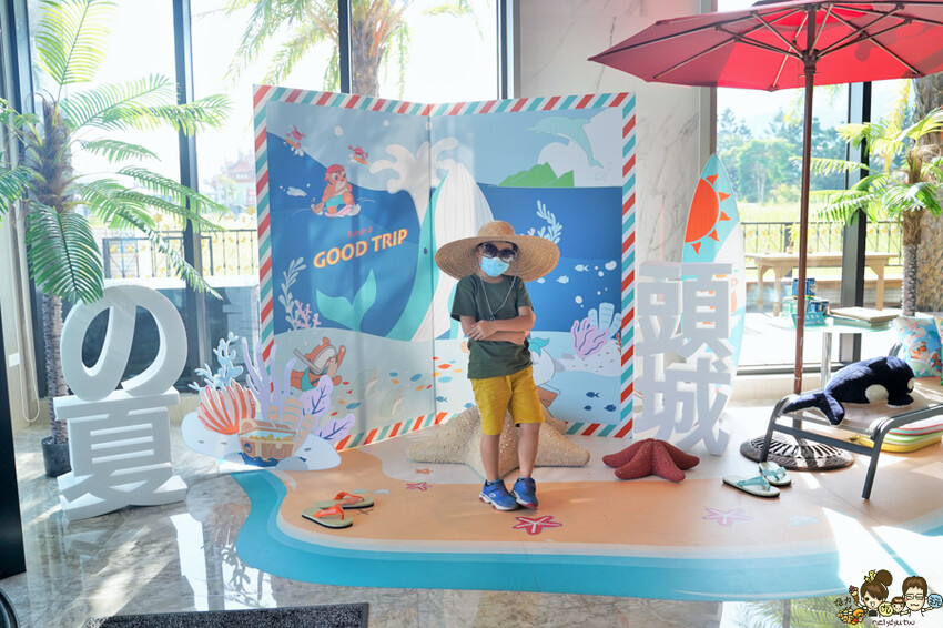 一進門讓孩子很開心,很有夏季海灘風格的裝置,可以互動拍照