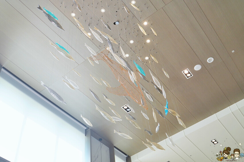 天花板裝置帶有宜蘭海灣魚群設計的琉璃
