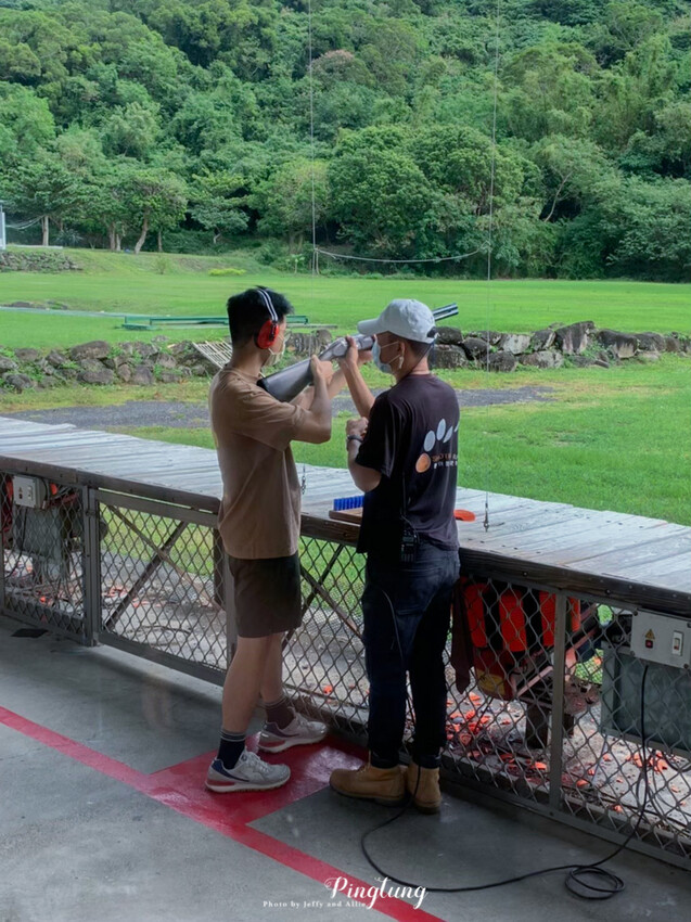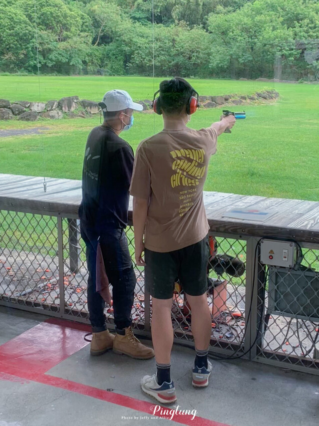 接著進入最刺激的打靶環節啦,難得來一次,我們決定一次體驗散彈槍與空氣槍!體驗的過程中會帶上耳罩,才不會被槍聲嚇到也保護耳朵。散彈槍要瞄準從下方噴出來的飛靶,飛靶移動的很快,但是也不會太難打中,Jeffy幾乎每發都中,滿滿的成就感!