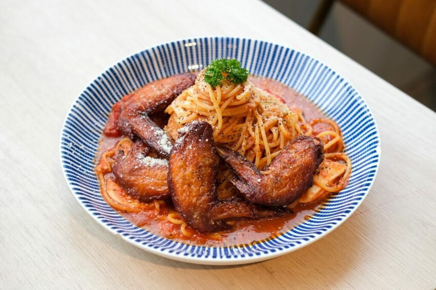 ▼沾滿紅通通醬汁的義大利麵,擺上五隻香烤微焦的雞翅,還沒入口前就能聞到濃郁香氣。