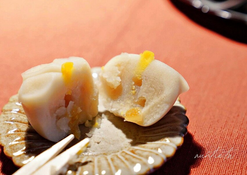 微酒釀糖漬黃檸皮餡,沒有日本的和菓子那麼甜,搭配台灣清爽的茶飲剛剛好,精緻度跟美味度都很夠,尤其又是帶有檸檬口味的菓子,尤其喜歡。