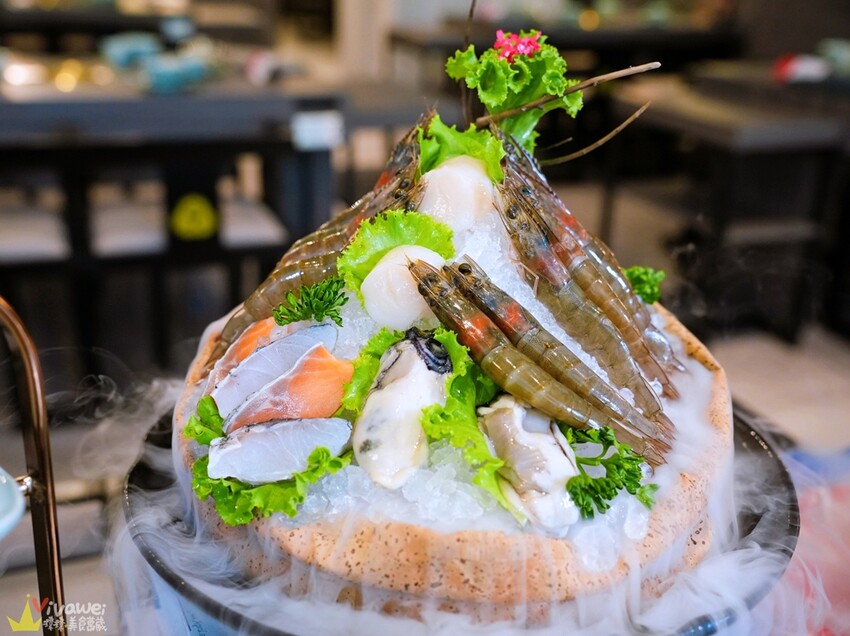 ▲仙氣海宴的內容物有白蝦、廣島蠔、日本北海道干貝、台灣帶皮鱸魚片、智利鮭魚片等食材!海鮮食材底部撲了滿滿的碎冰保鮮~每一款食材都非常新鮮(內容物會隨季節調整)!