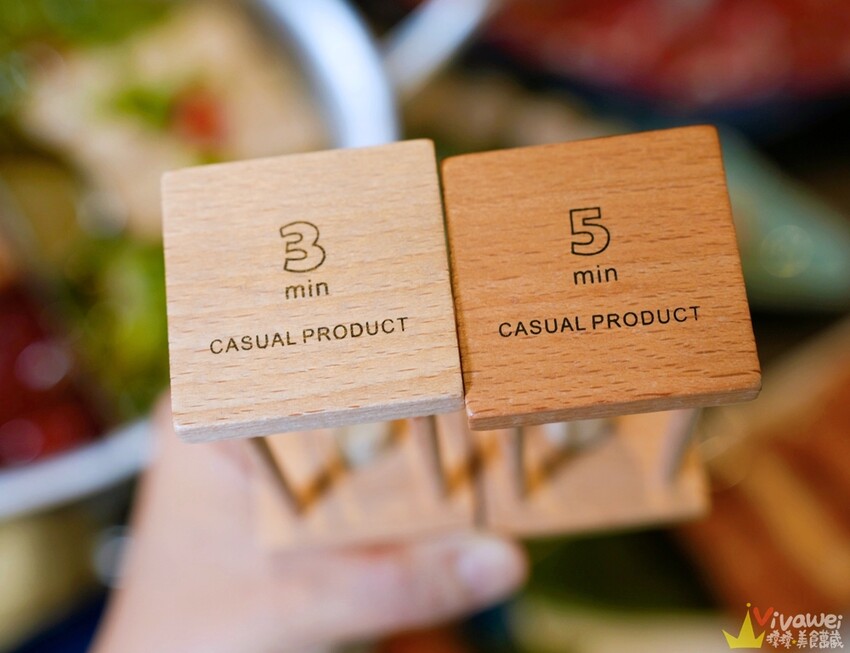 ▲青花驕在座位旁還放了兩個沙漏,一個沙漏是三分鐘、一個沙漏是五分鐘,服務人員會告知不同食材需要下鍋加熱的黃金時間!