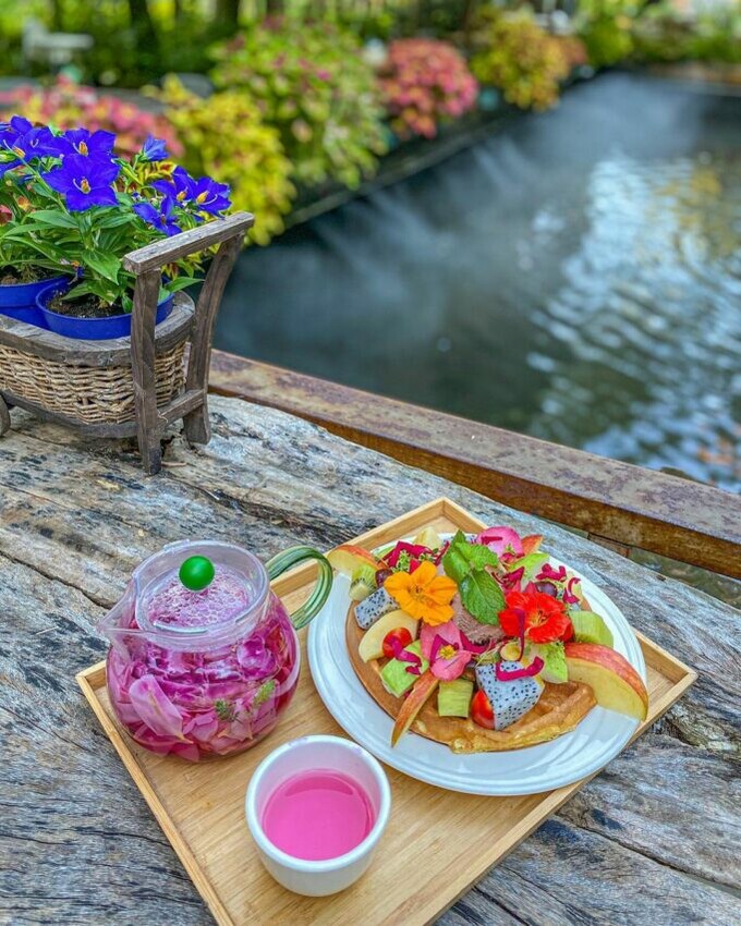 坐在這裡來杯下午茶,隨手一拍都是美照。另外,餐點上面的新鮮花朵都是可以直接食用的唷!使用農場自種自採自熬的玫瑰花醬、搭配卓蘭在地鮮果與食用新鮮玫瑰花,給你不同的味蕾饗宴。