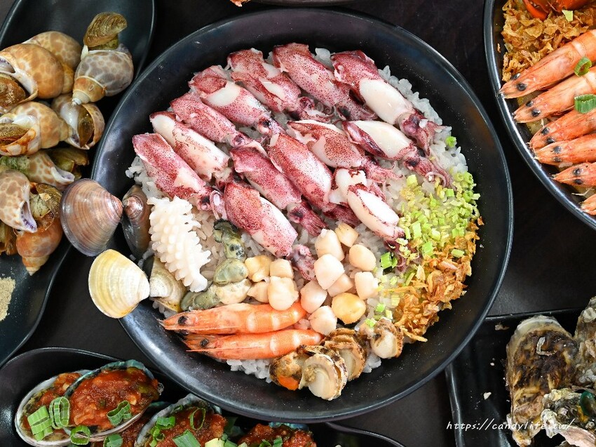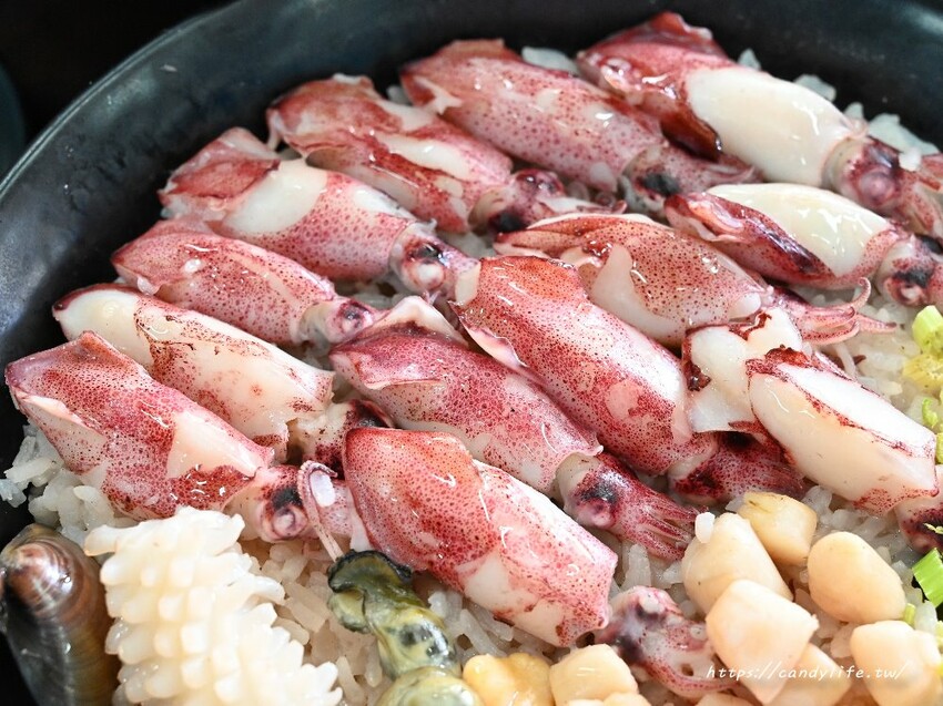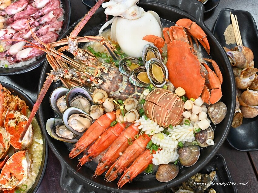 10種海鮮裡頭包含了蛤蜊、鮑魚、淡菜、干貝、花枝、大海蝦、扇貝肉,還有活體紅蟳及超巨大的正海花枝,肉質Q彈帶微微嚼勁,鮮甜可口,覺得太大隻不好食用可以請店家幫忙分食唷