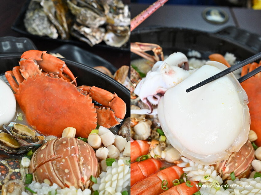 粥狂裡頭最狂的就是就是這款地表最強啦,上桌時不是用碗裝,而是直接用鍋裝啦!這份量直接成為全場焦點,店家說這是兩人份,糖糖怎麼覺得這3-4人份吃也綽綽有餘呀,光是裡頭的海鮮就有10種