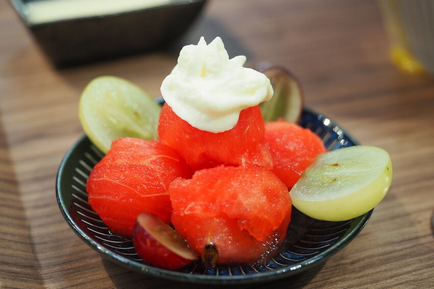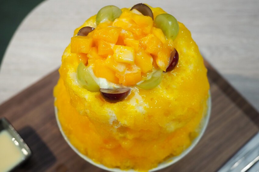 芒果刨冰山的最上方是滿滿的芒果丁.葡萄切片