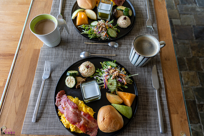 民宿管家準備的早餐相當豐盛,有著生菜沙拉、烤時蔬、馬鈴薯泥、培根炒蛋、餐包、水果和抹茶凍,整個份量很足又營養,搭配咖啡真的是滿分的早餐。
