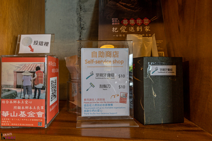 因爲現在都是實施低碳的旅宿所以沒有提供一次性的盥洗用品,如果真的沒有帶可以到櫃子的自助商店購買,自行拿取和把錢投入,民宿會把這些錢拿去做公益,注重環保盥洗用品還是自己帶比較好喔!